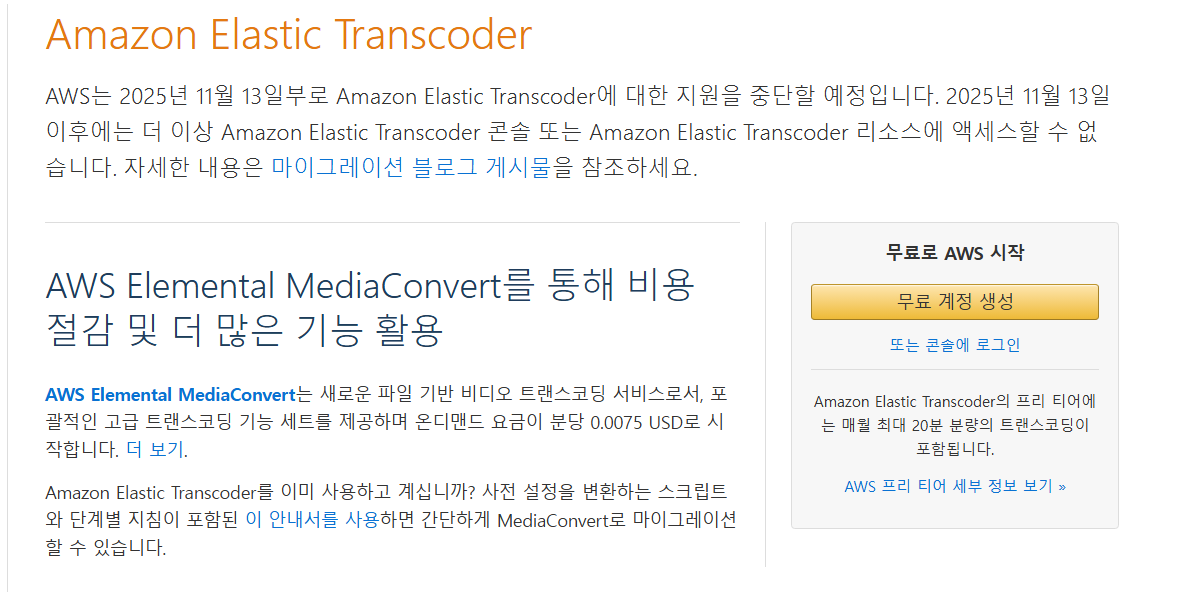 최근 확인한 바로 Elastic Transcoder가 2025년 11월로 서비스 종료한다는 이슈가 있었다.
