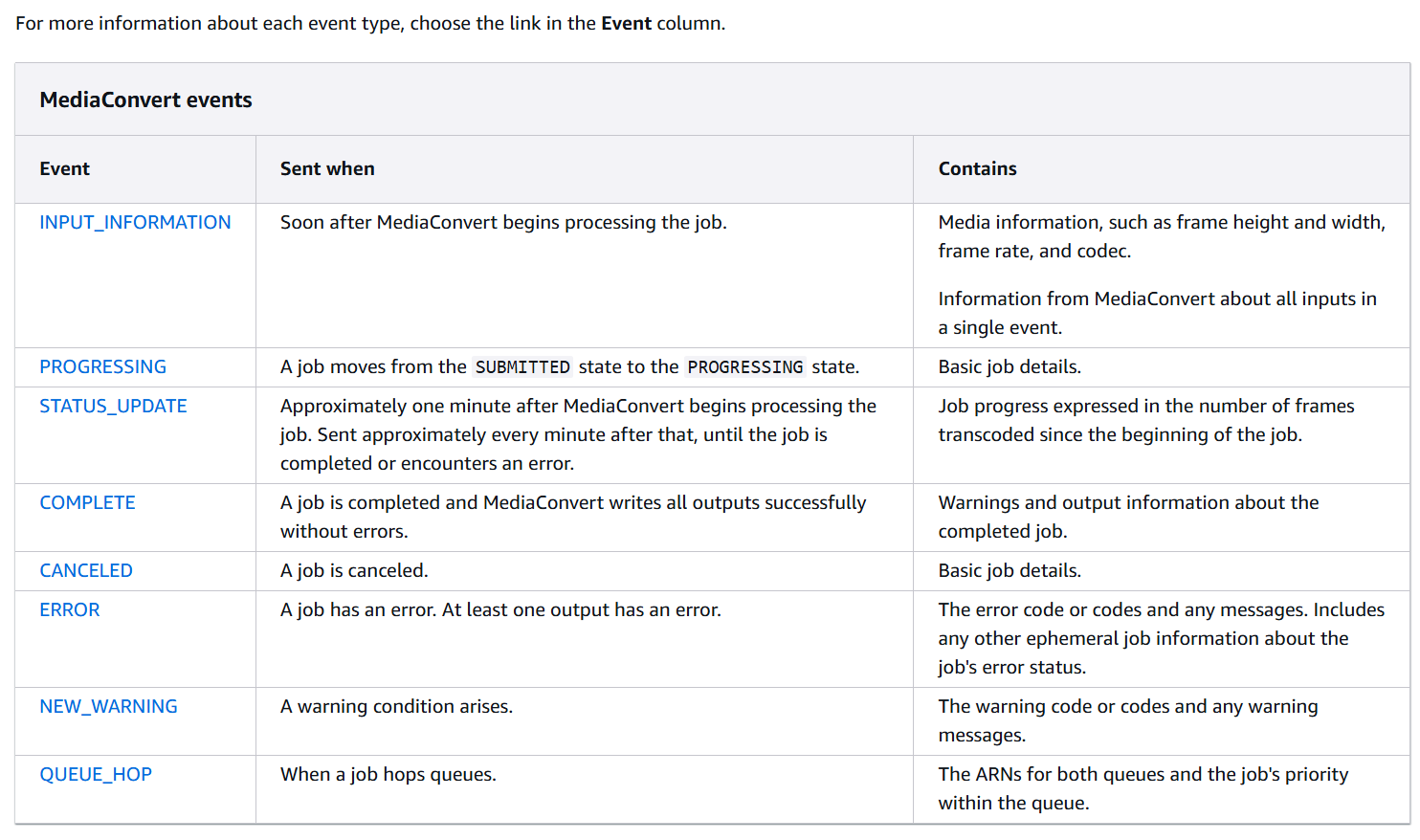 그리고 MediaConvert Job의 Status에 따라 발생할 수 있는 이벤트 종류는 아래와 같다. Eventbridge에서 이러한 이벤트 이름을 통해 앞서 제시해준 포맷을 통해 rule을 생성할 수 있다.