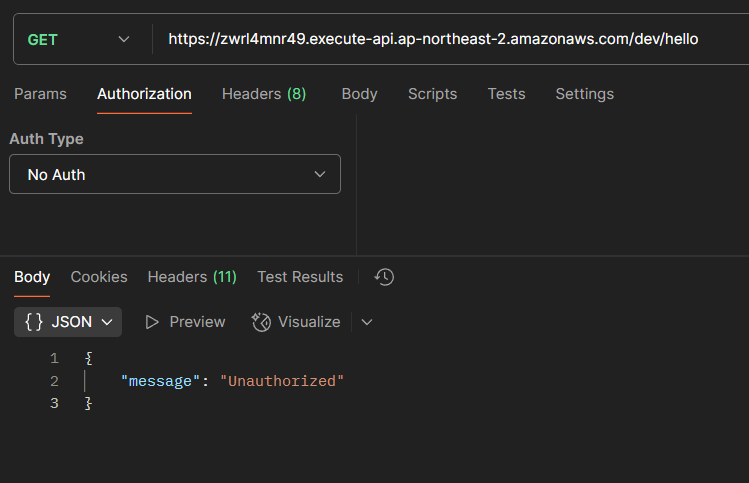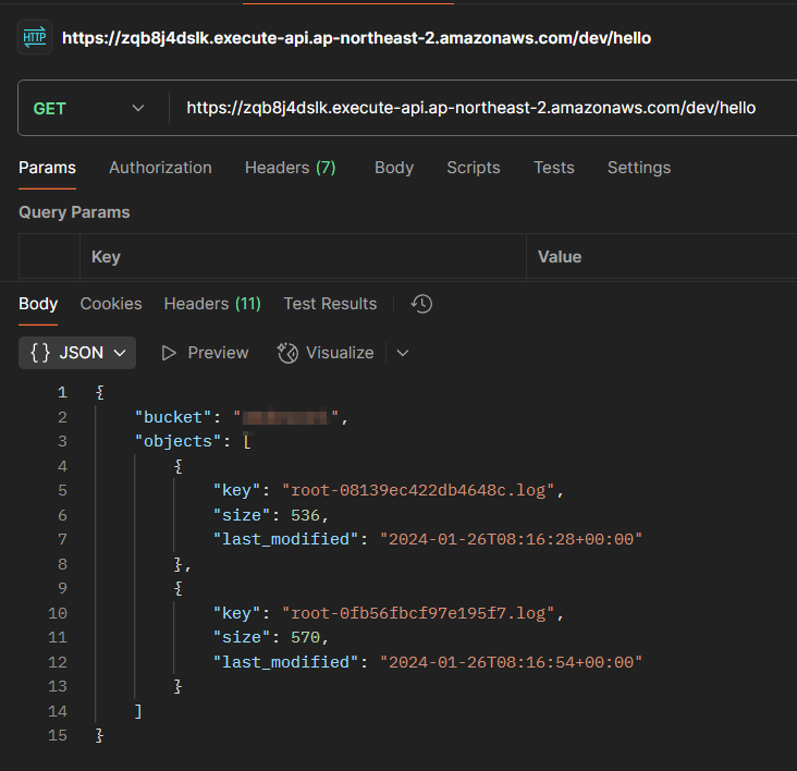 이제 API Gateway URL을 통해 연결한 Lambda에 접근할 수 있는지 테스트해볼 수 있다.