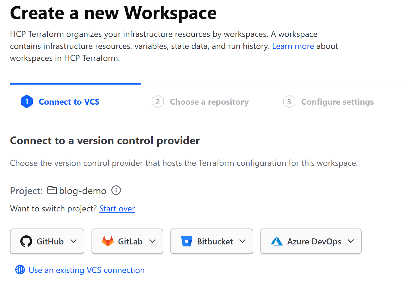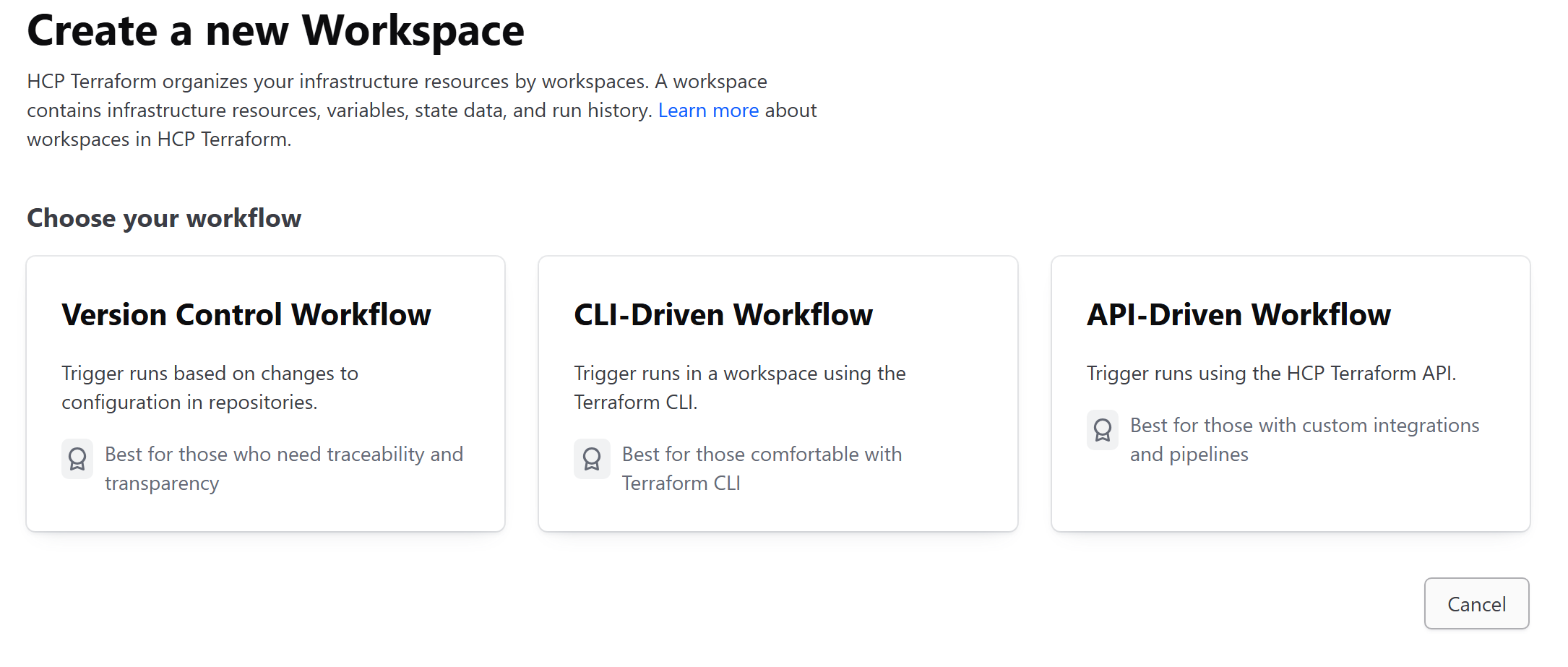 Organization과 Project를 생성한 뒤, Workspace를 생성하려면 아래와 같이 3가지 Workflow 옵션이 주어진다.