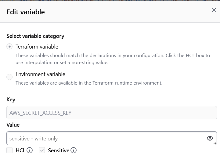 앞서 Repo에서 terraform 리소스를 만들때, AWS Access Key를 Terraform 변수로 지정을 해주었기에 workspace에서 이 변수 값을 생성해주어야한다.