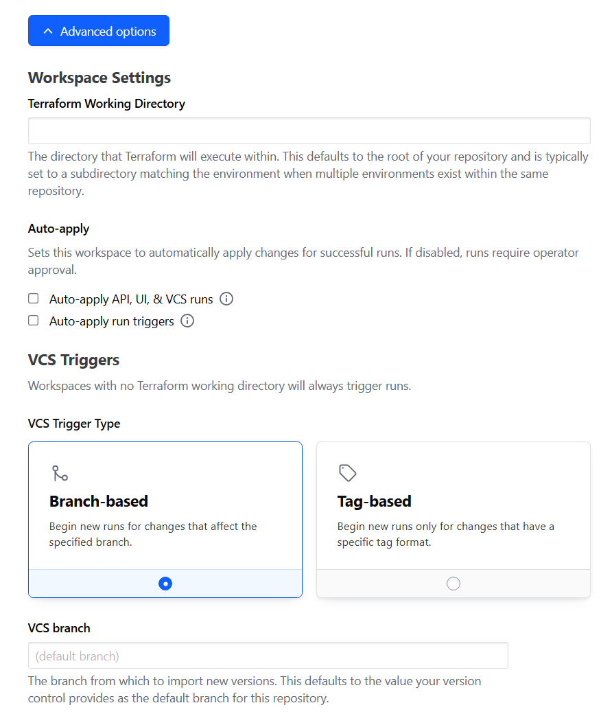 Terraform 적용 작업이 트리거되는 방식을 선택하는 부분이며, 트리거 기반을 VCS/CLI/API 중에서 선택하게된다.