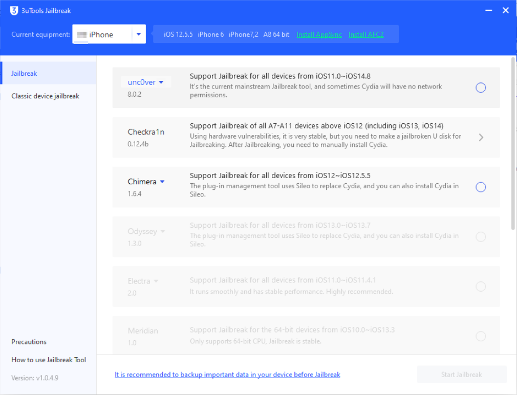 애플 정책 상 구버전의 ios로 다운그래이드는 사실상 거의 불가능하므로 탈옥 진행 시 이 부분을 주의깊게 확인 해야한다.
