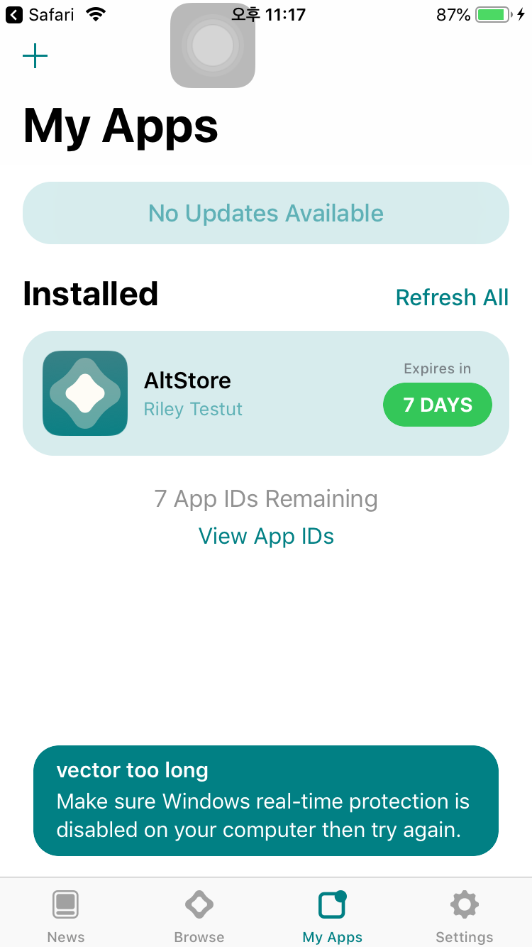 아래와 같은 에러(vector too long) 발생 시 윈도우의 실시간 보호를 끄고 다시 unc0ver를 설치