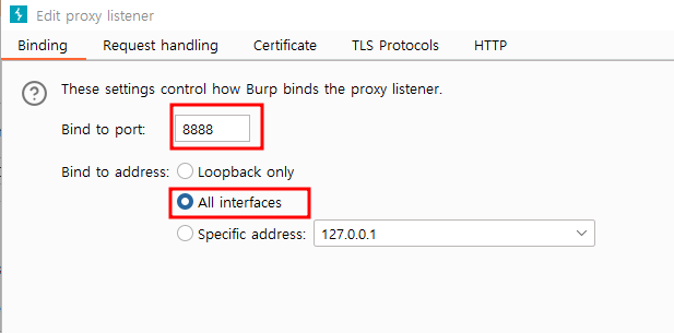 - 프록시 포트 : 아까 burp에서 설정해준 포트 값