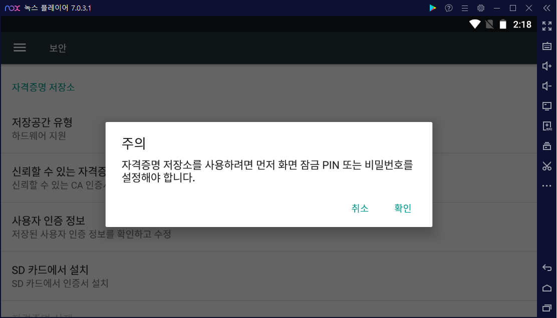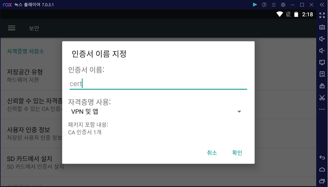 Nox와 실 안드로이드 디바이스에서의 인증서 설치과정은 동일하다