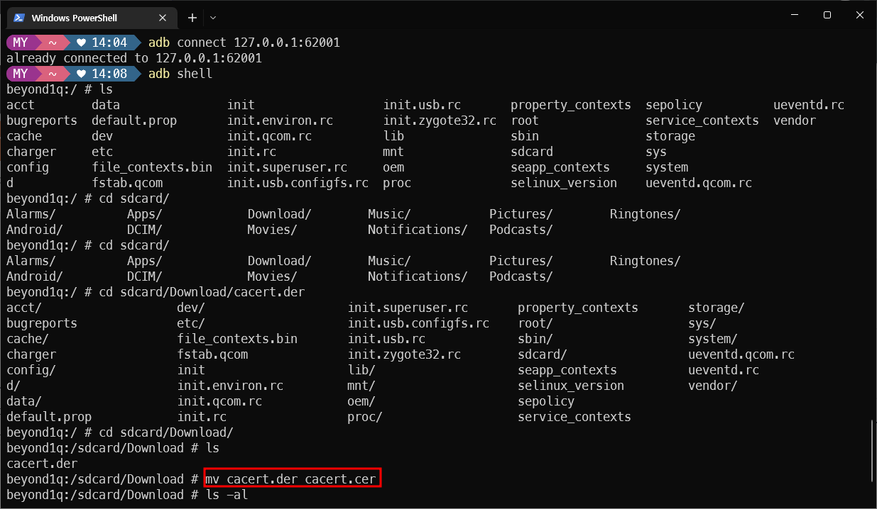 - adb 접속 > mv cacert.der cacert.cer