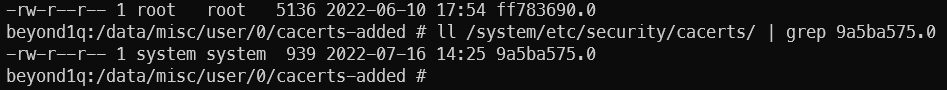 - 다시 adb 연결 > cd /data/misc/user/0/cacerts-added (방금 설치한 인증서 확인)