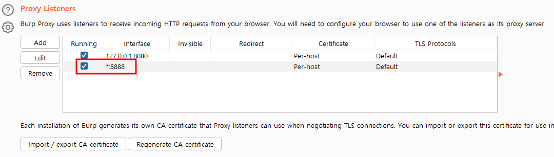 - Proxy > Options > Proxy Listeners에서 add