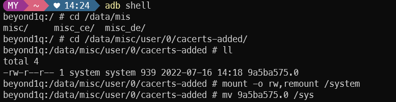 - 마운트 시킨 후 /system/etc/security/cacerts 경로로 인증서 이동