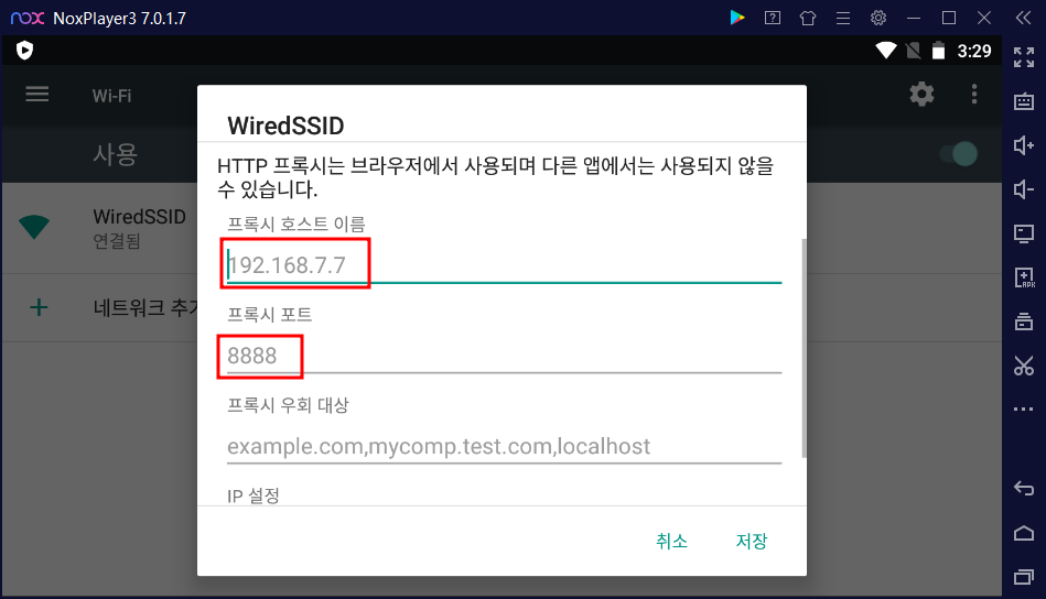 - nox에서 연결된 wifi > 네트워크 수정 > 프록시 '수동'