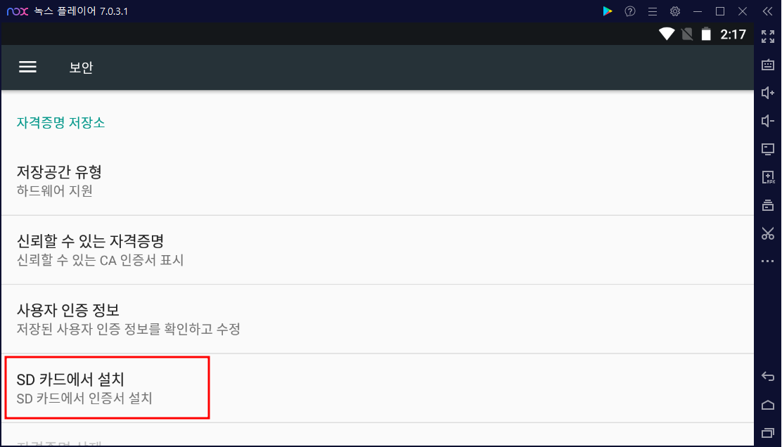 - 보안 > 자격증명 저장소 > SD카드에서 설치