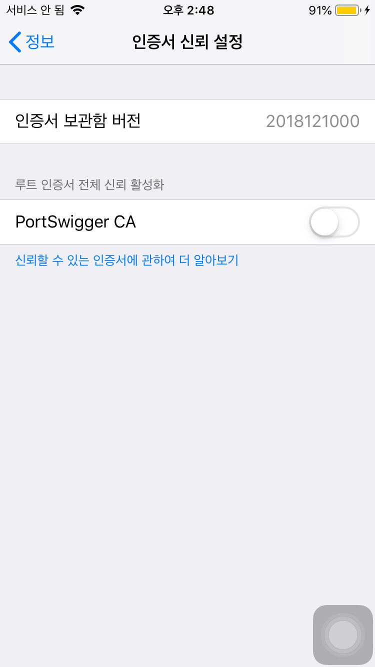 - 설정 > 일반 > 프로파일 및 기기 관리 > Portswigger CA > 프로파일 설치