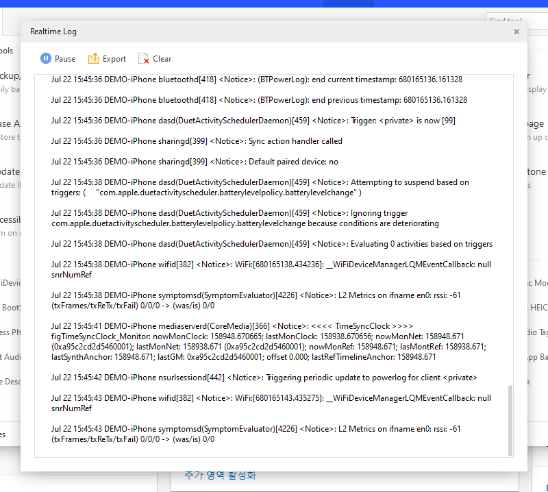 디바이스의 로그 내역을 실시간으로 확인할 수 있다.