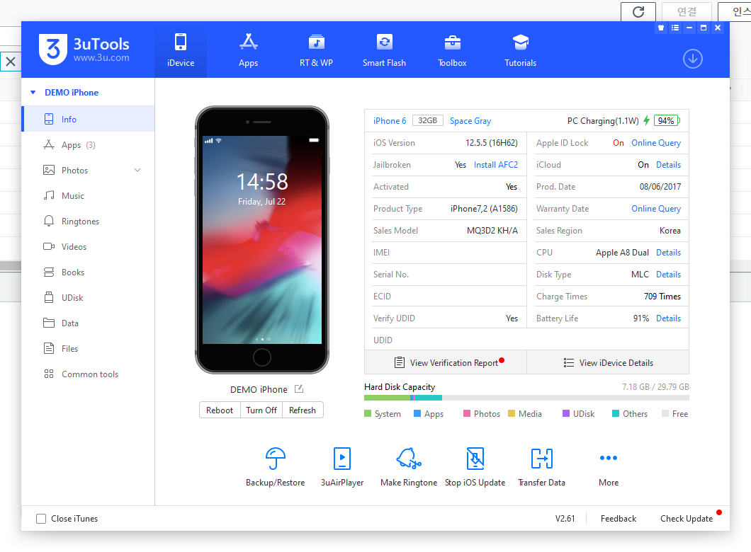 배터리 사이클 부터 cpu 정보,탈옥여부 까지 거의 웬만한 정보는 다 나온다. 사진이나 앱 관리들도 쉽게 가능하다.