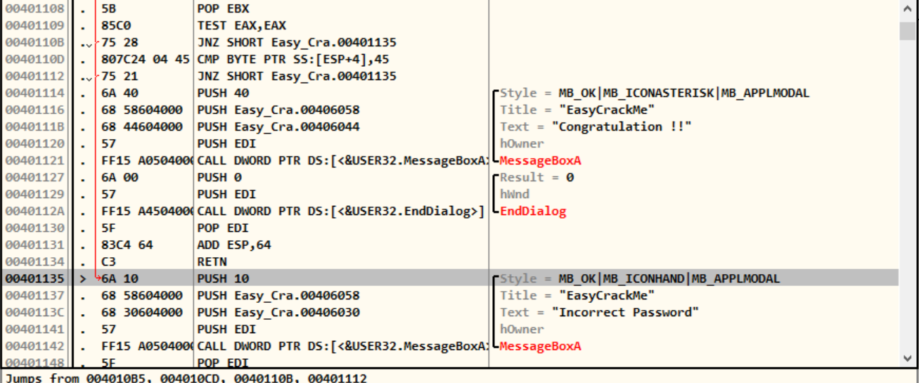 실패의 경우로 넘어오는 코드는 004010B5, 004010CD, 0040110B, 00401112가 있다
