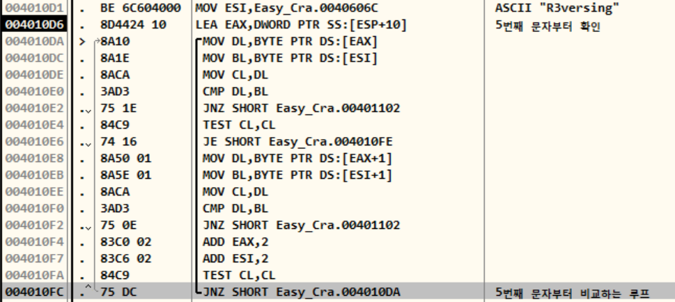 다음으로는 루프가 등장하는데, 입력값의 5번째 문자부터 끝까지 따온 후 "R3versing"과 비교하는 과정이다