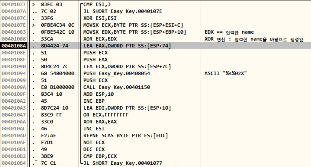 XOR ECX,EDX 해주는 부분에서 확인한 결과인데, EDX에는 입력한 문자열의 문자가 하나씩 들어가고, ECX에는 10, 20, 30이 순차적으로 돌면서 들어가는 것으로 확인 됐다