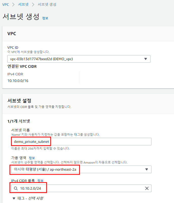 VPC는 생성해줬던 DEMO_vpc를 선택하면 서브넷을 설정할 수 있다.