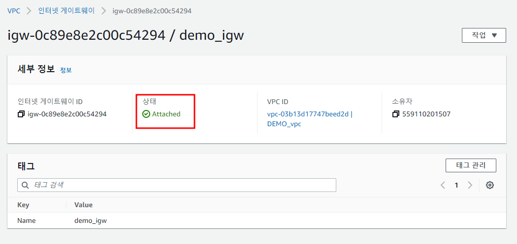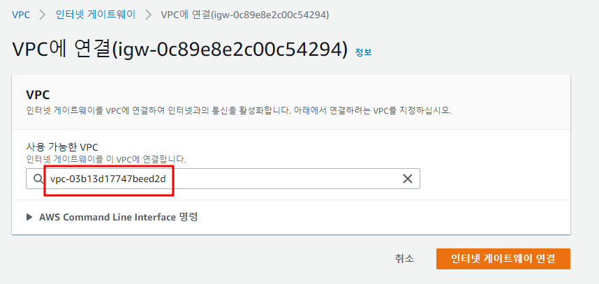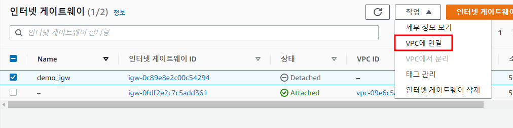 인터넷 게이트웨이를 생성했으면 VPC에 붙여줘야한다