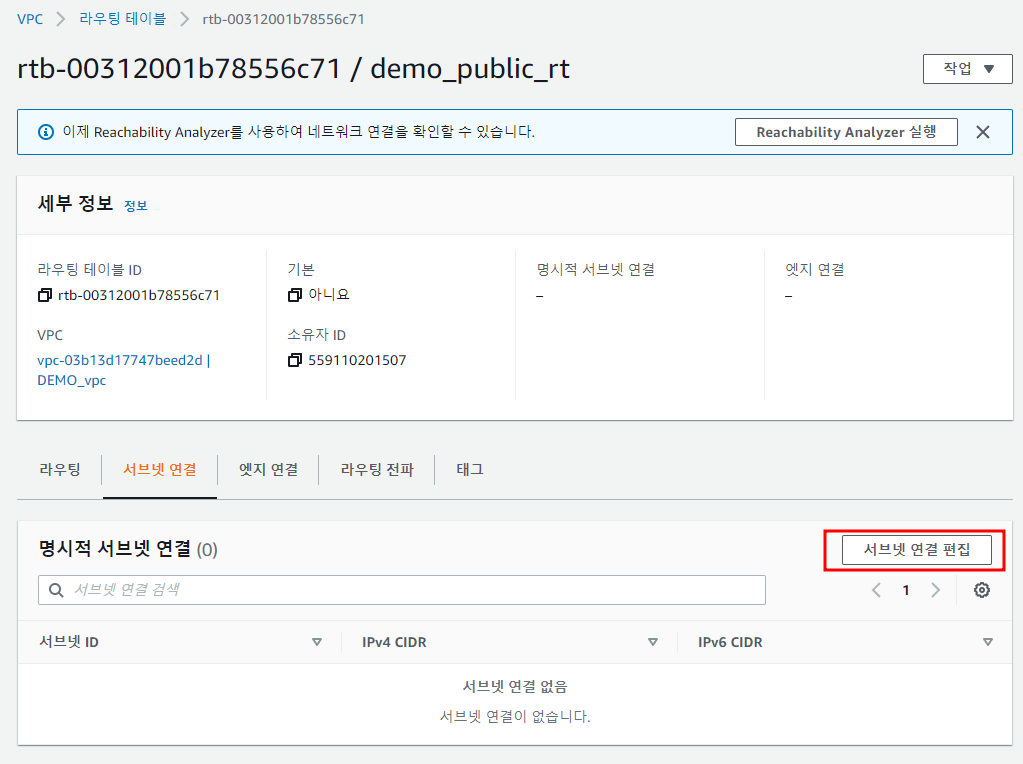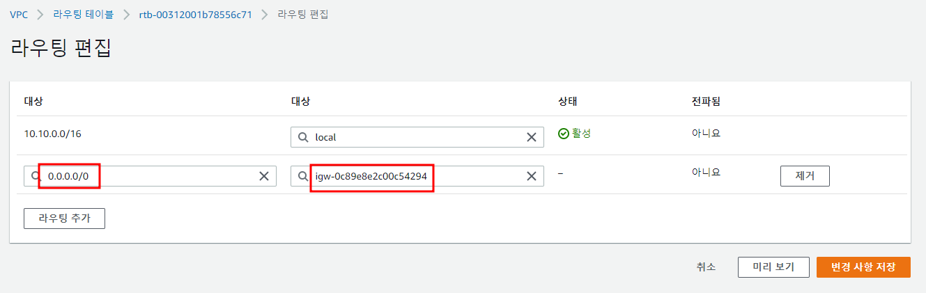 Public subnet은 외부에서 접속이 되어야하므로 인터넷 게이트웨이를 라우팅 테이블에 등록해주어야 한다.