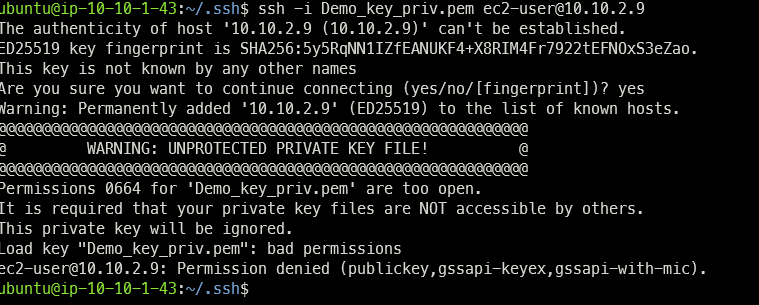 +) ssh private key의 권한이 너무 느슨하게 주어진 경우 ssh 접속 시 Private Key 관련 warning이 발생하면서 접속이 되지 않는다.
