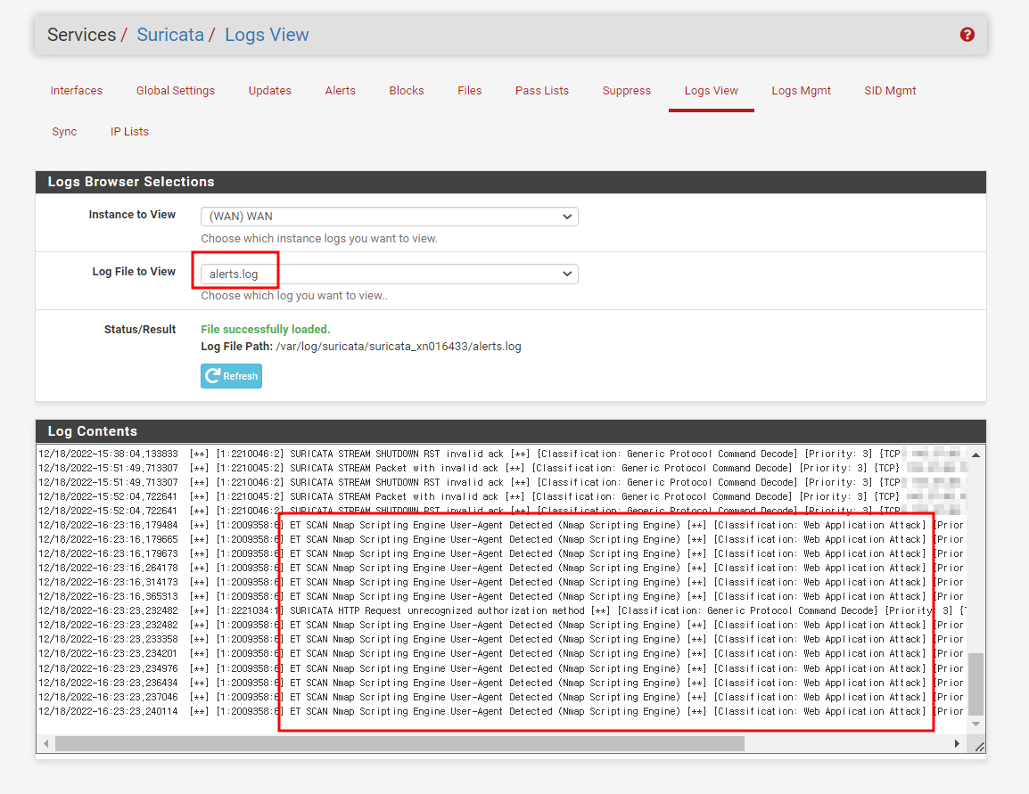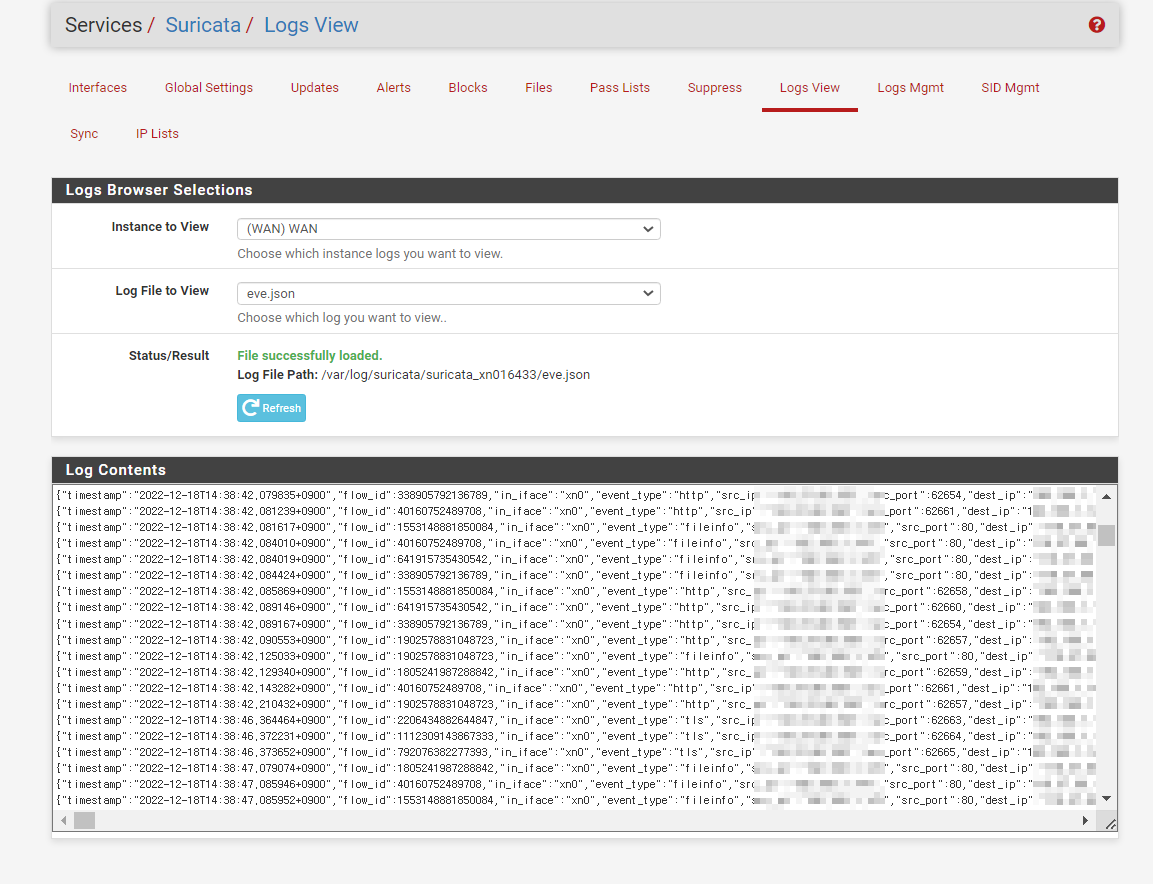 Suricata가 실행되면 Logs View 탭에서 인터페이스 별로 로그내용을 모두 확인할 수 있다.