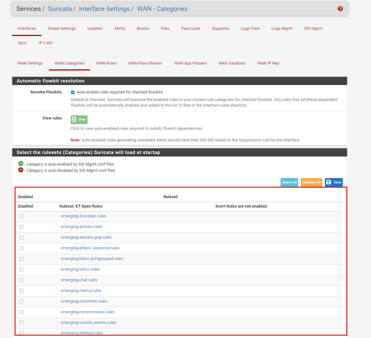 인터페이스 세팅 후, WAN Categories에서 다운받았던 ETOpen Emerging Threats rules 목록을 볼 수 있다.