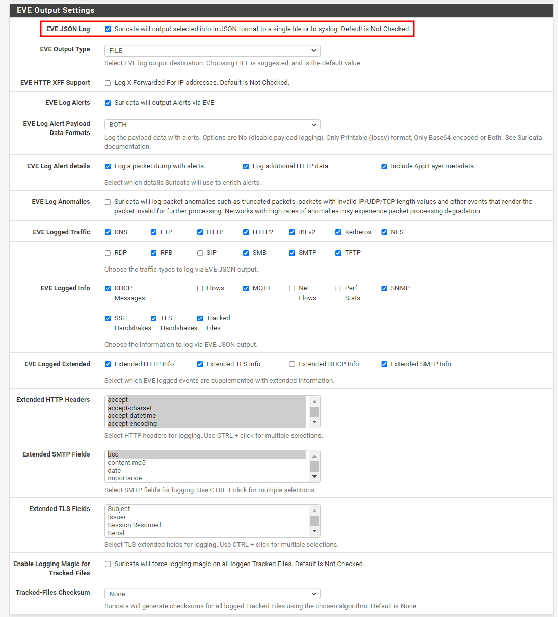 - EVE Logged Traffic : 로깅할 트래픽의 프로토콜 설정