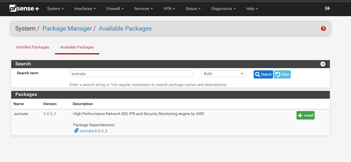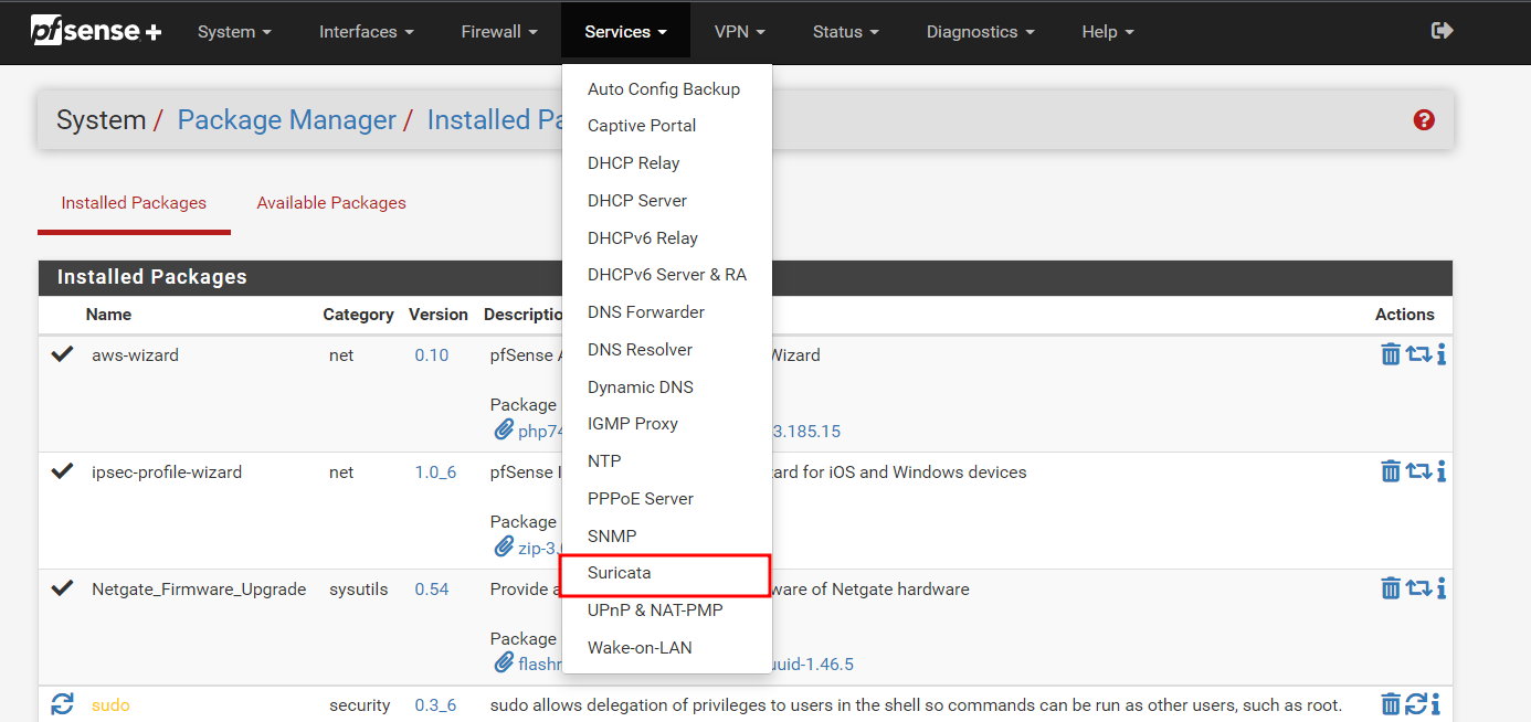 web-gui > System > Package Manager에 Available Packages를 통해 suricata를 검색
