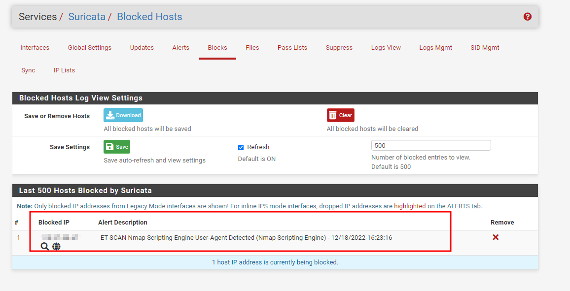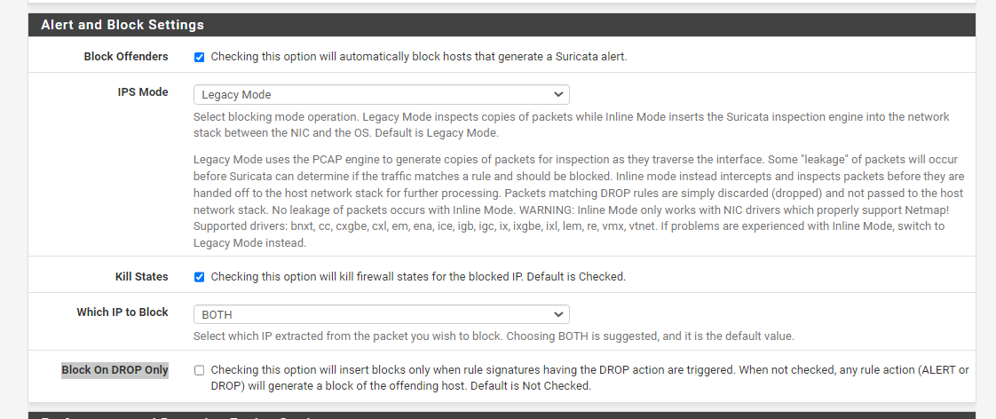 interface 세팅에 Alert and Block Settings에서 Block Offenders 체크하면 IPS 모드가 활성화되며 IPS Mode 설정을 할 수 있다.