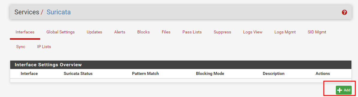 설치 후, Services > Suricata 탭이 생성된다
