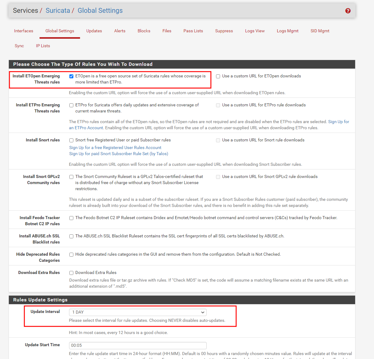Install ETOpen Emerging Threats rules 체크, 하단의 Update interval을 설정