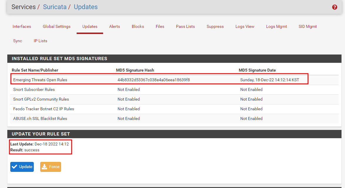 Update 탭으로 넘어가 Rule 업데이트를 해준다. 최초 설정에서 rule이 받아진 후 update interval 마다 자동으로 업데이트가 진행된다.