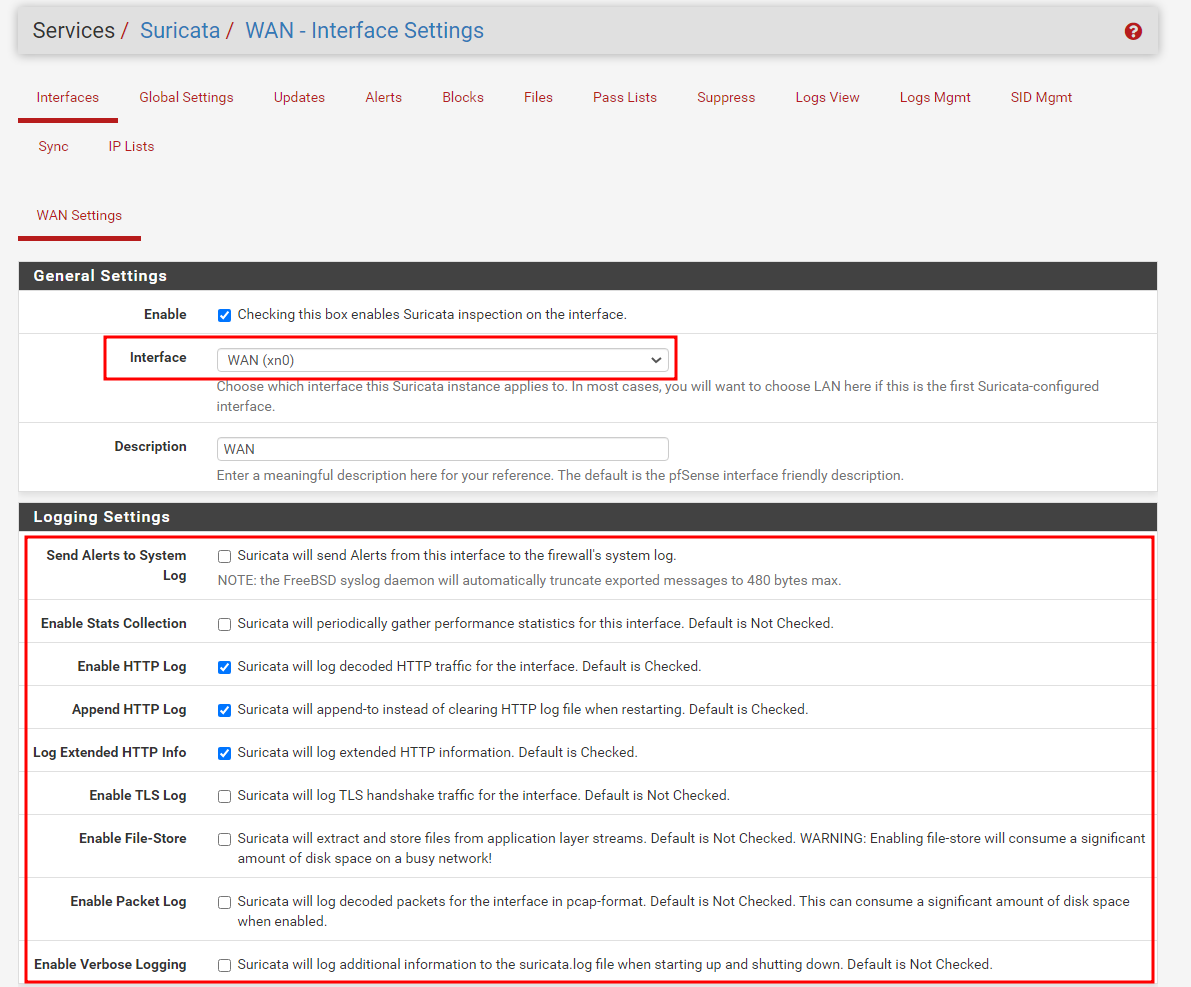 Suricata가 탐지할 인터페이스를 세팅하는 구간으로, WAN/LAN 중 아무 곳이나 설정해준다.