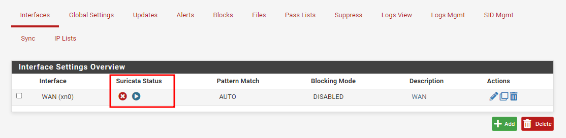 일단 인터페이스는 default로 구성후 생성, suricata status의 버튼으로 해당 인터페이스를 on/off 시킬 수 있다.