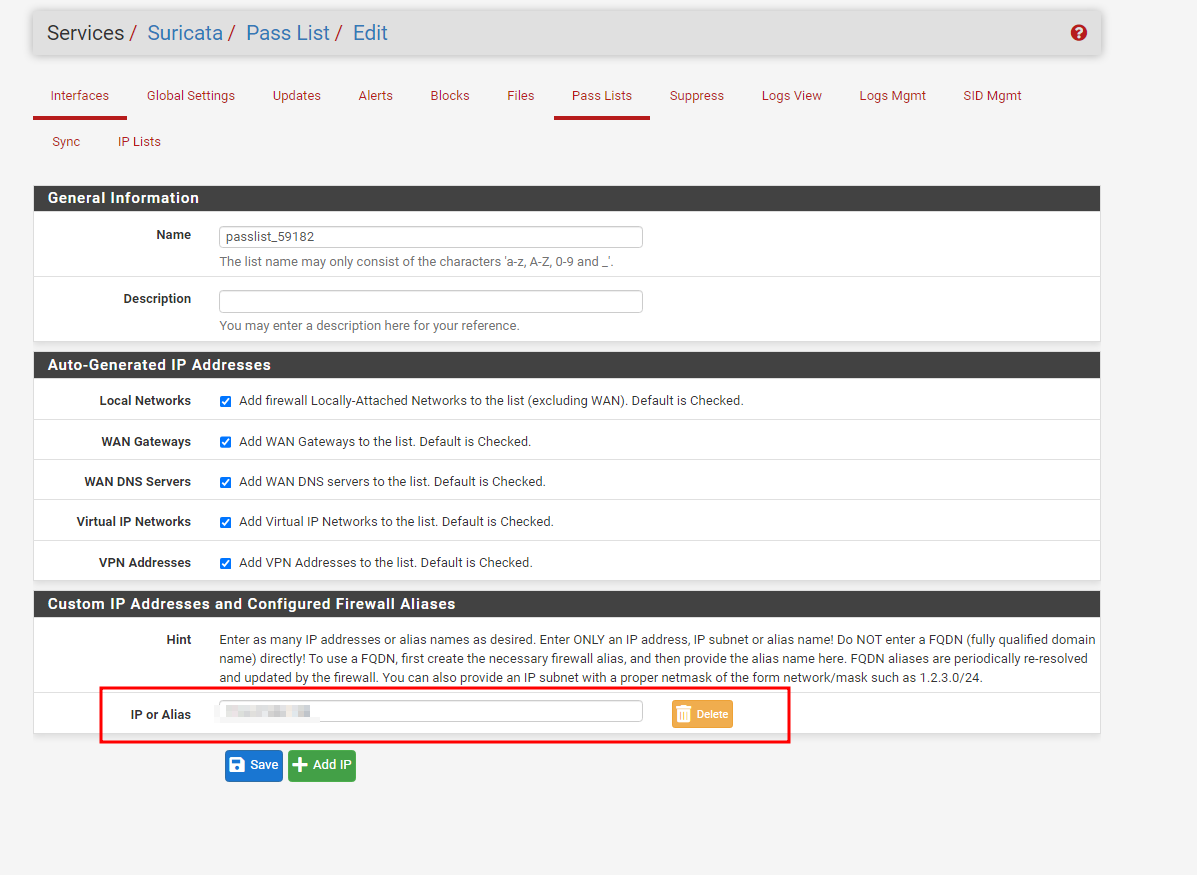 Service > Suricata > Pass List에서 ip를 등록 시킬 수 있다.