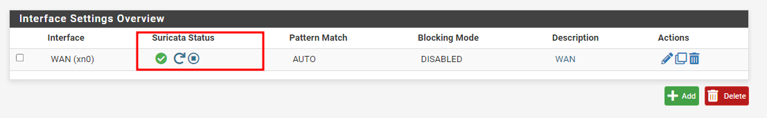 일단 인터페이스는 default로 구성후 생성, suricata status의 버튼으로 해당 인터페이스를 on/off 시킬 수 있다.