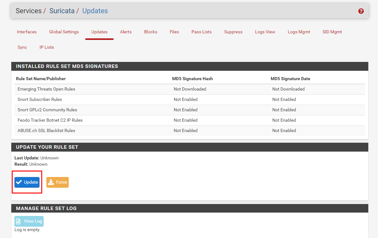 Update 탭으로 넘어가 Rule 업데이트를 해준다. 최초 설정에서 rule이 받아진 후 update interval 마다 자동으로 업데이트가 진행된다.