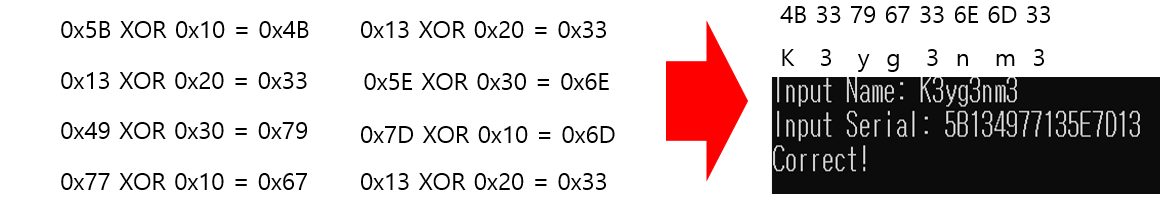 따라서, 문제에서 요구하는 5B134977135E7D13가 Serial이 되기 위해서는 거꾸로 XOR연산을 해주면 본래의 Name을 알 수 있다