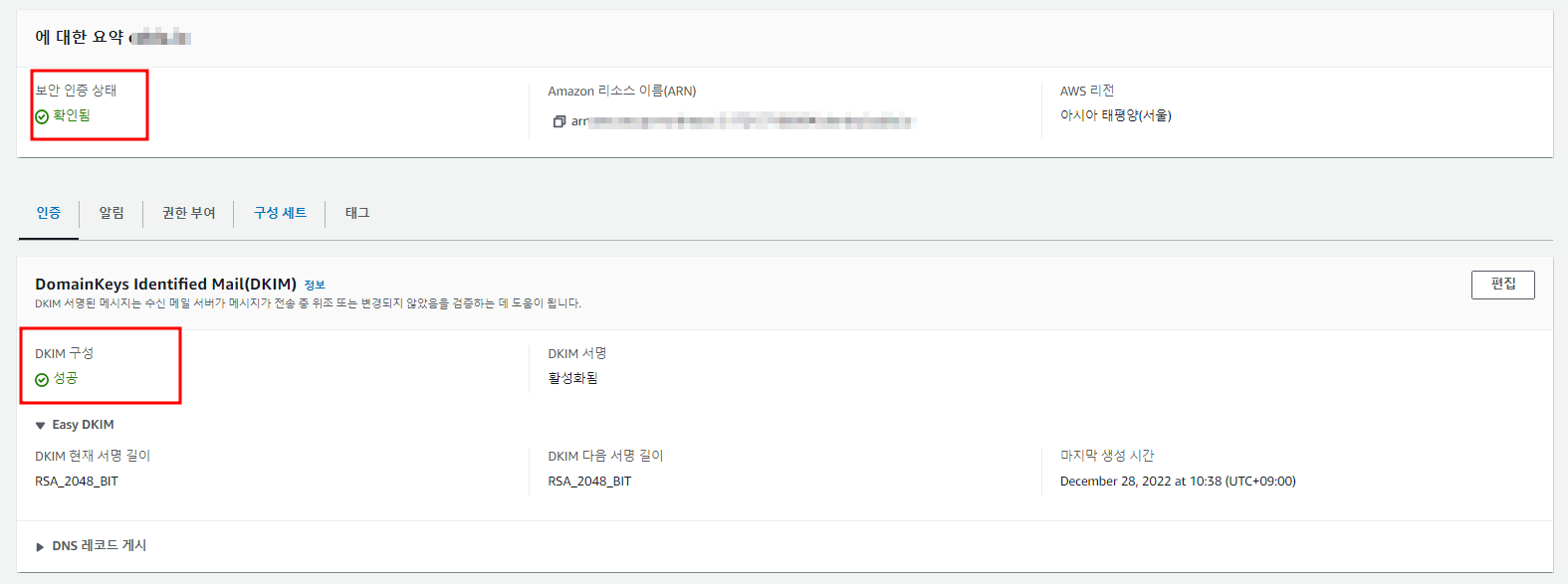 도메인 identity 생성의 경우 DKIM이라고 하는 도메인 확인 절차가 추가로 존재하는데, SES에서 요구하는 몇개의 확인용 CNAME 레코드를 생성해서 소유권을 확인하는 절차이다.