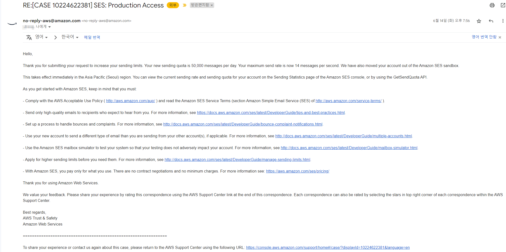 이 Sandbox는 각 리전 별로 분리가 되어있어 다른리전에서도 SES를 사용하고자 하는 경우, 그 리전의 Sandbox 해지를 별도로 해주어야 한다.