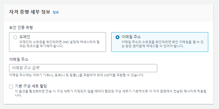 도메인 단위와 이메일 주소 단위 중에서 선택 가능하며 도메인 단위로 생성한 경우 해당 도메인의 모든 이메일 주소가 확인되어 해당 도메인의 개별 이메일들의 자격증명 생성작업을 해주지 않아도 된다.