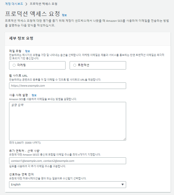 - 추가 연락처 : 이 요청을 보내는 경우, 요청의 내용과 처리결과를 받을 수 있는 이메일을 적는 구간, 따로 적지 않는 경우 Root 계정의 이메일로만 전송된다.