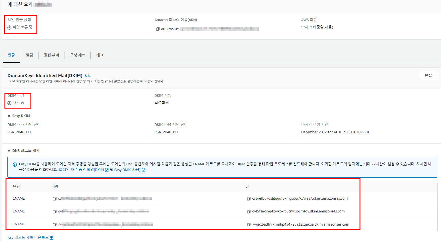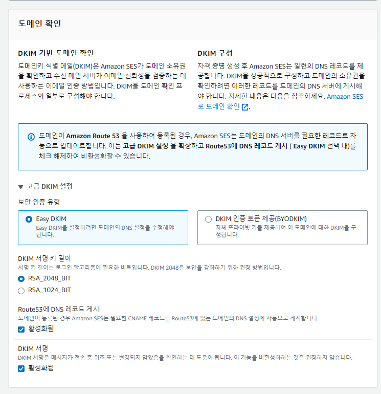 도메인 identity 생성의 경우 DKIM이라고 하는 도메인 확인 절차가 추가로 존재하는데, SES에서 요구하는 몇개의 확인용 CNAME 레코드를 생성해서 소유권을 확인하는 절차이다.
