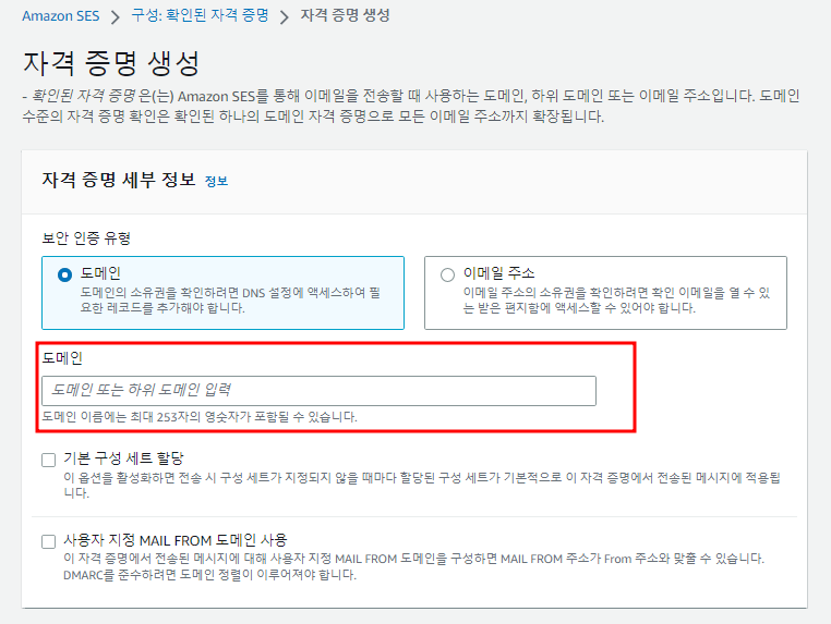 도메인 단위와 이메일 주소 단위 중에서 선택 가능하며 도메인 단위로 생성한 경우 해당 도메인의 모든 이메일 주소가 확인되어 해당 도메인의 개별 이메일들의 자격증명 생성작업을 해주지 않아도 된다.