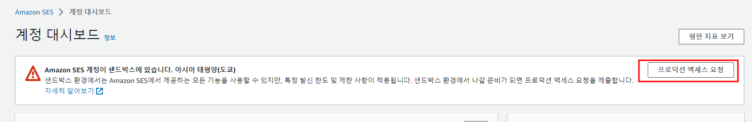 SES계정이 Sandbox에 있는 경우 계정 대시보드를 확인했을때 다음과 같은 경고가 존재한다.