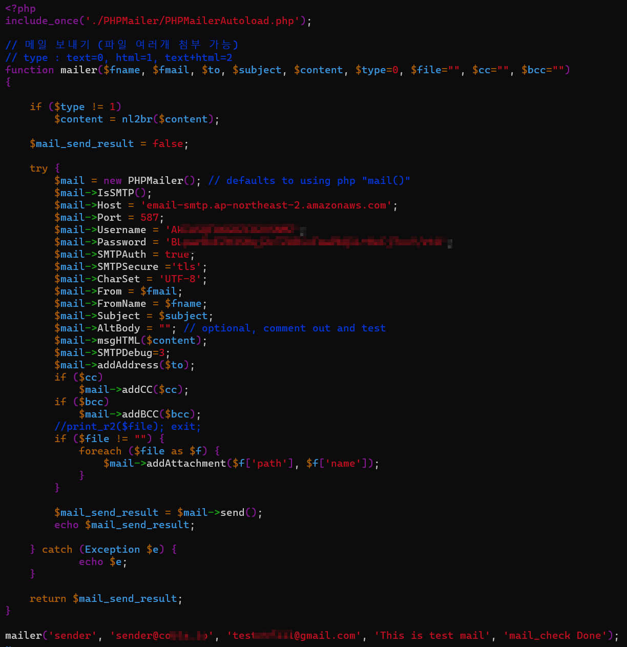 이제 이 계정을 바탕으로 실제 메일을 전송해보자, 간단하게 phpMailer를 이용해 전송해보았다.