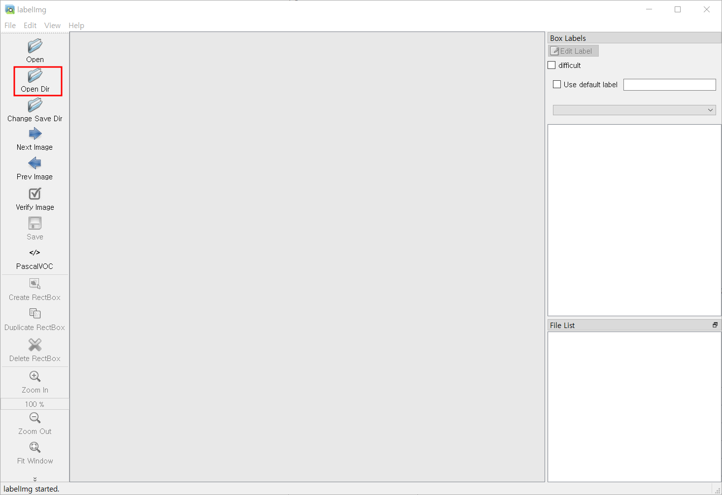 labelImg 설치 후 실행, 'Open Dir' 로 이미지가 저장된 폴더 선택하면 폴더 내의 모든 이미지를 불러온다.