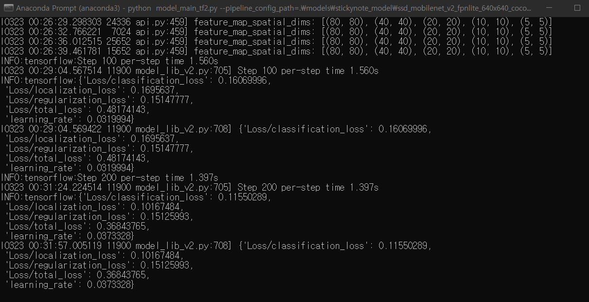 위의 pipeline.config 세팅까지 완료되면 학습을 시작